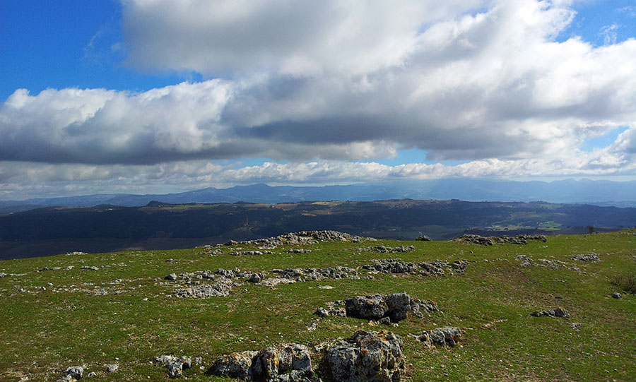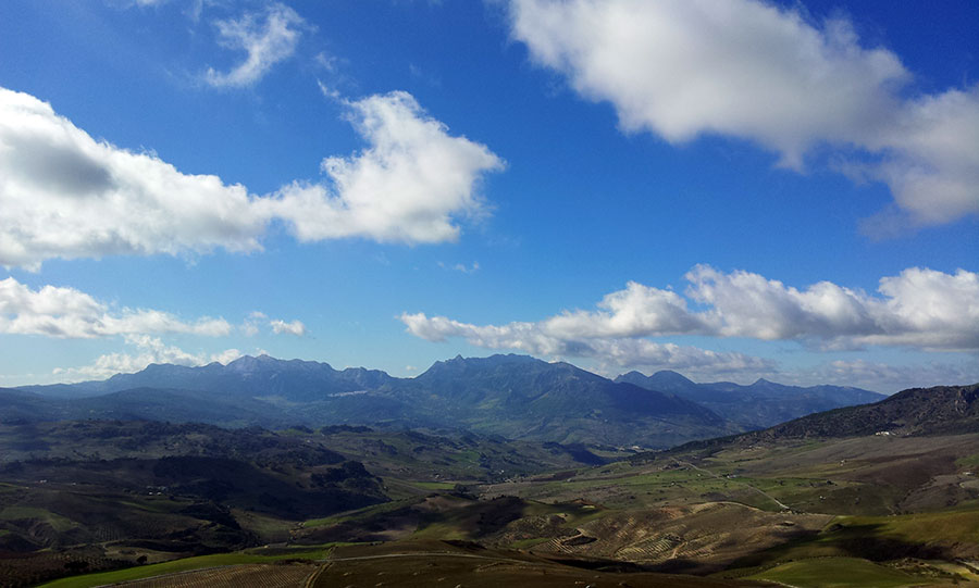 Desde Grazalema se divisa una montaña principal, inequívoca, con un perfil blanco correspondiente a las rocas que forman la montaña de Acinipo.