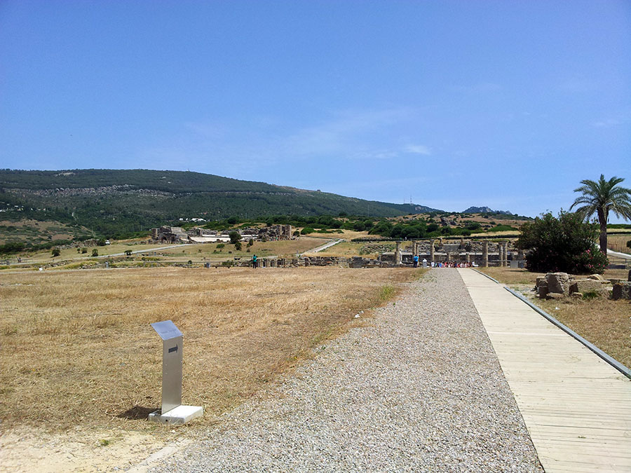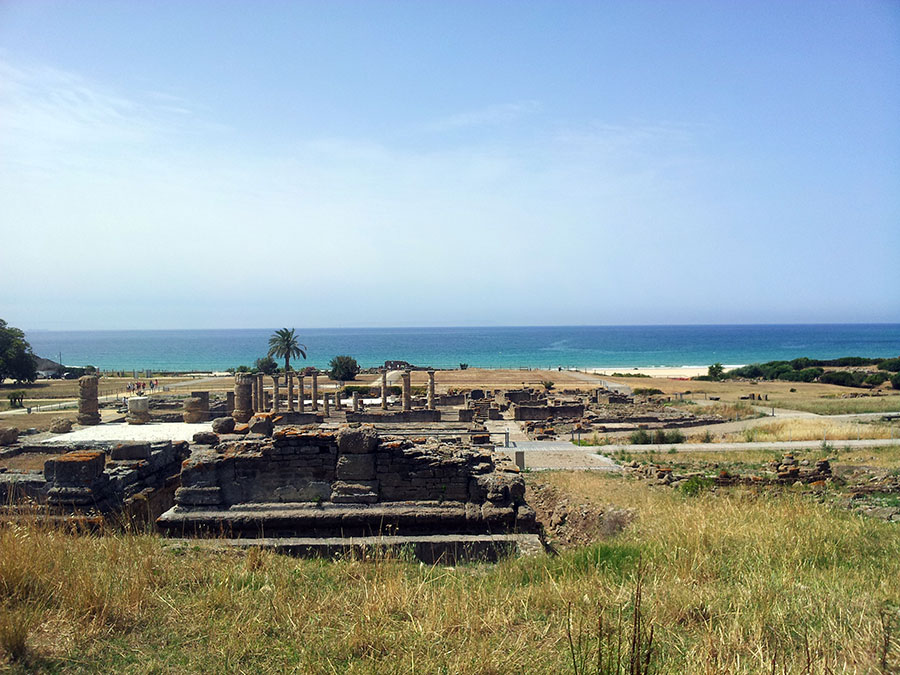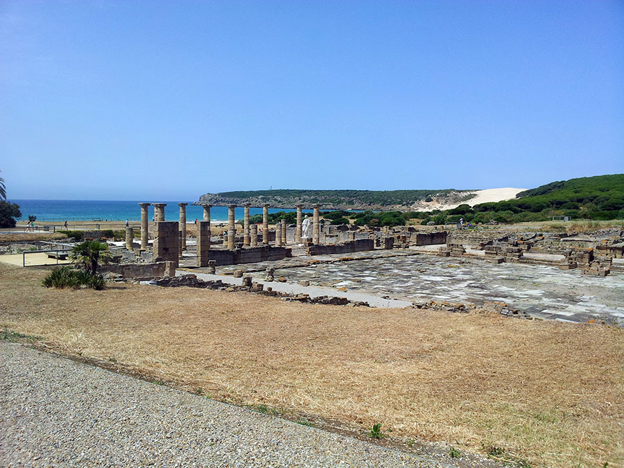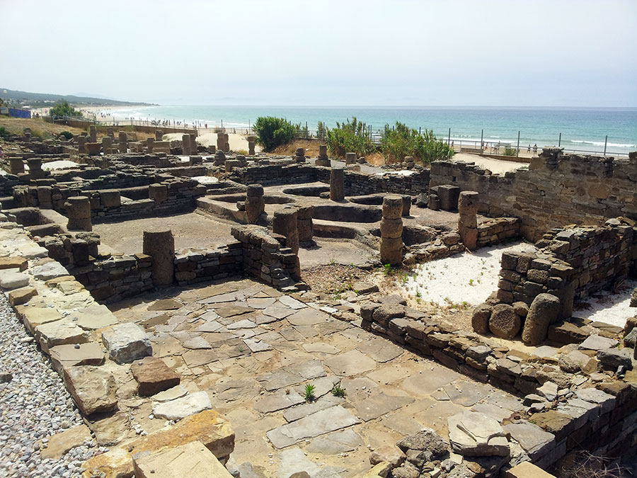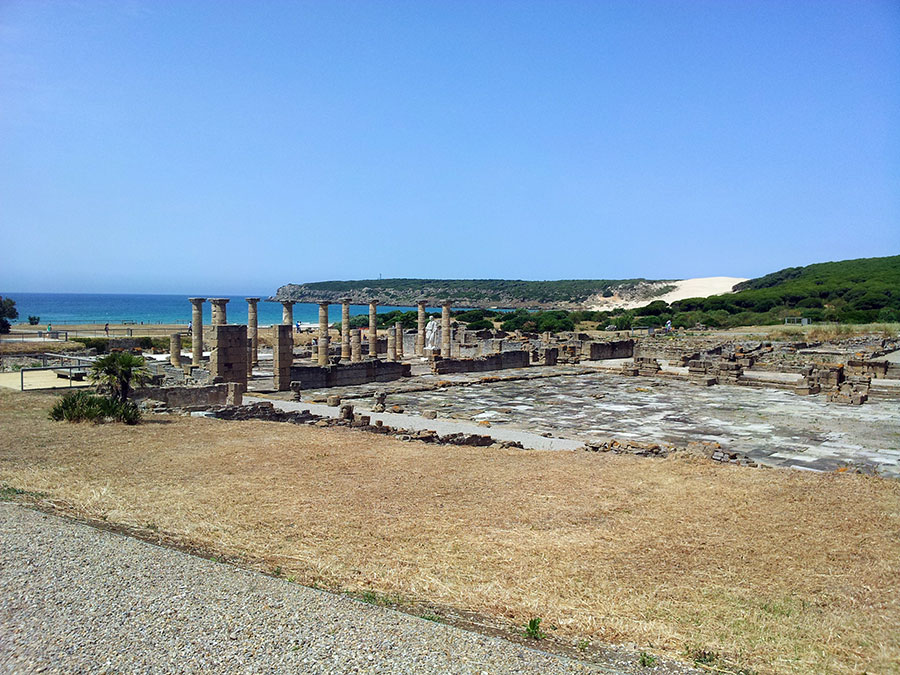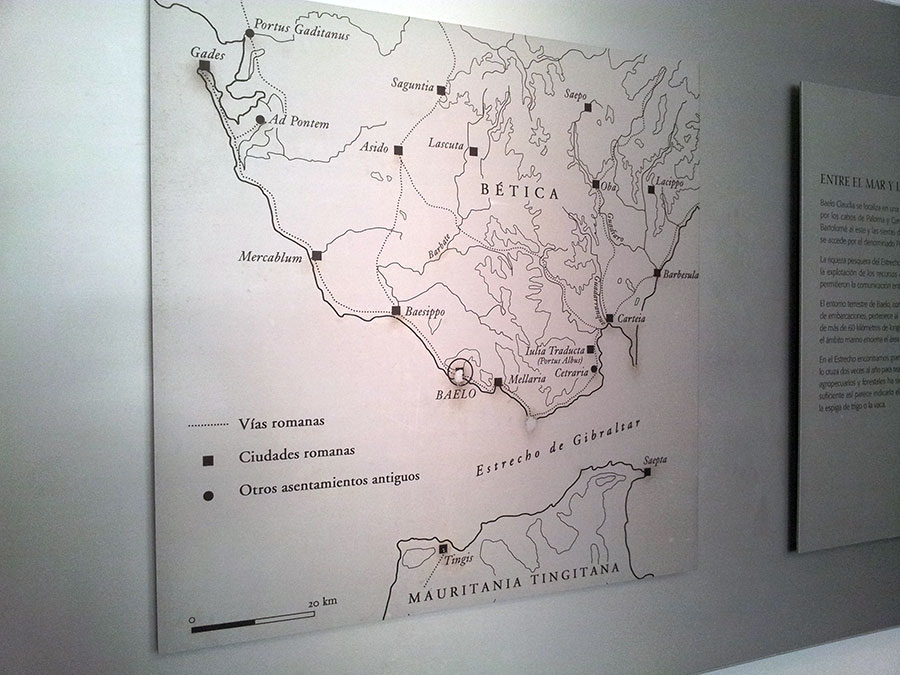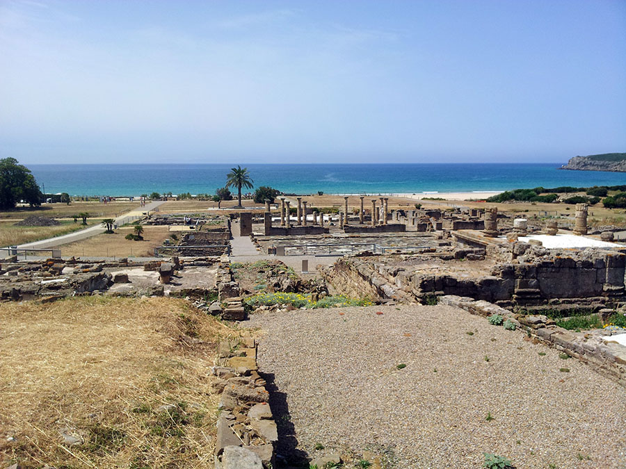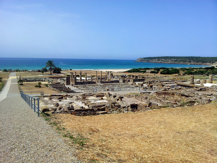 Baelo Claudia se localiza en una ensenada del litoral gaditano, en pleno estrecho de Gibraltar y delimita por los cabos de Paloma y Camarinal. Ésta pequeña bahía está rodeada por las elevaciones de la loma de San Bartolomé al este y las sierras de la Higuera y la Plata al oeste, que cierran el paso hacia el interior, al que sólo se accede por el denominado Puerto de Bolonia.