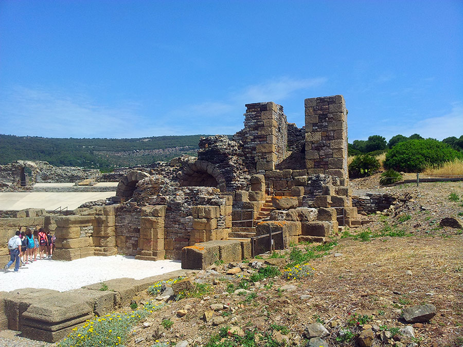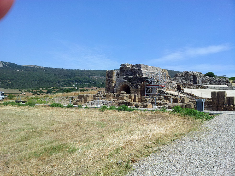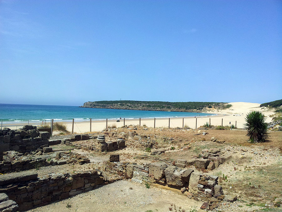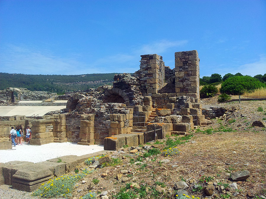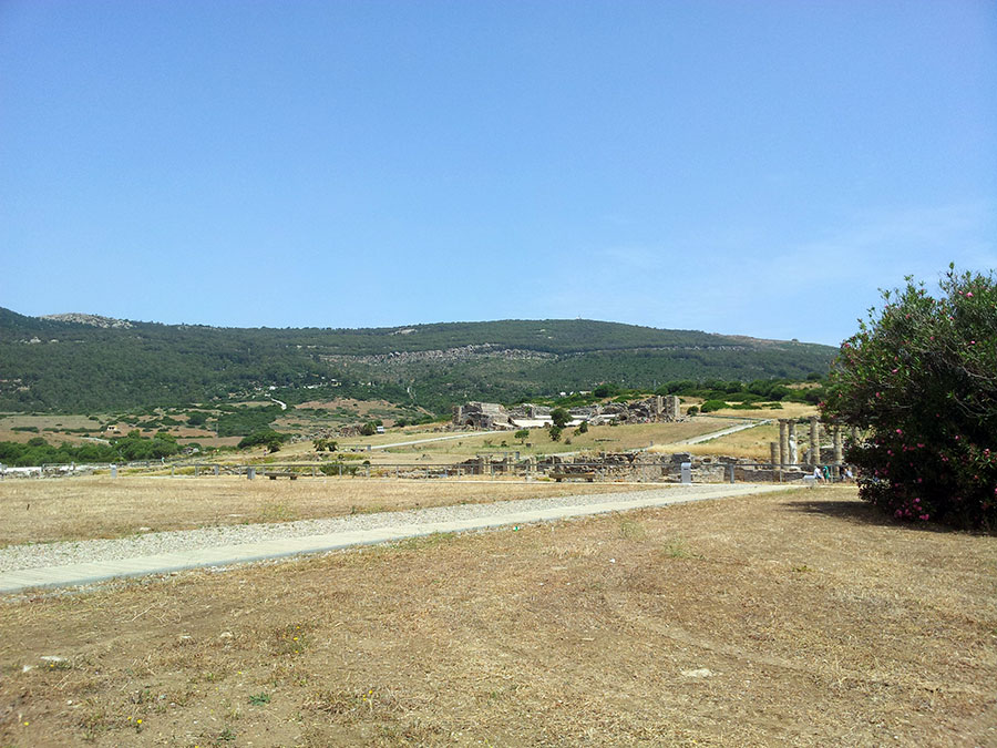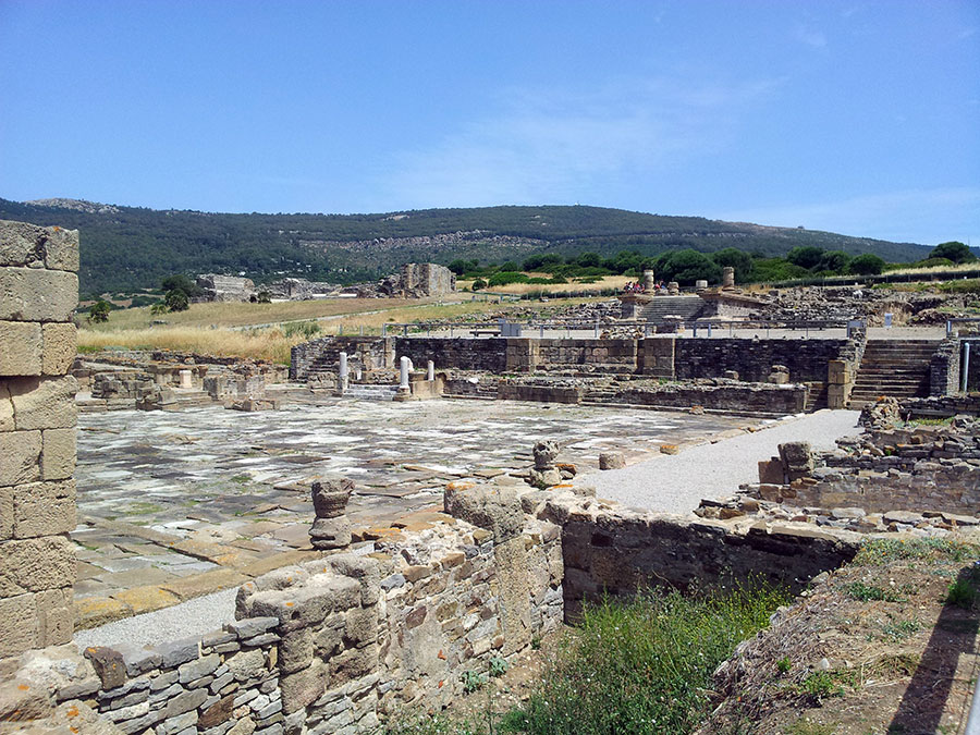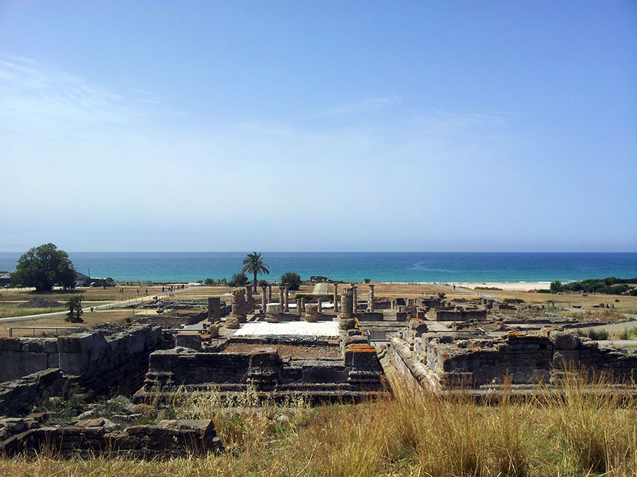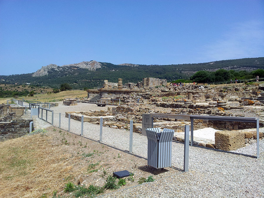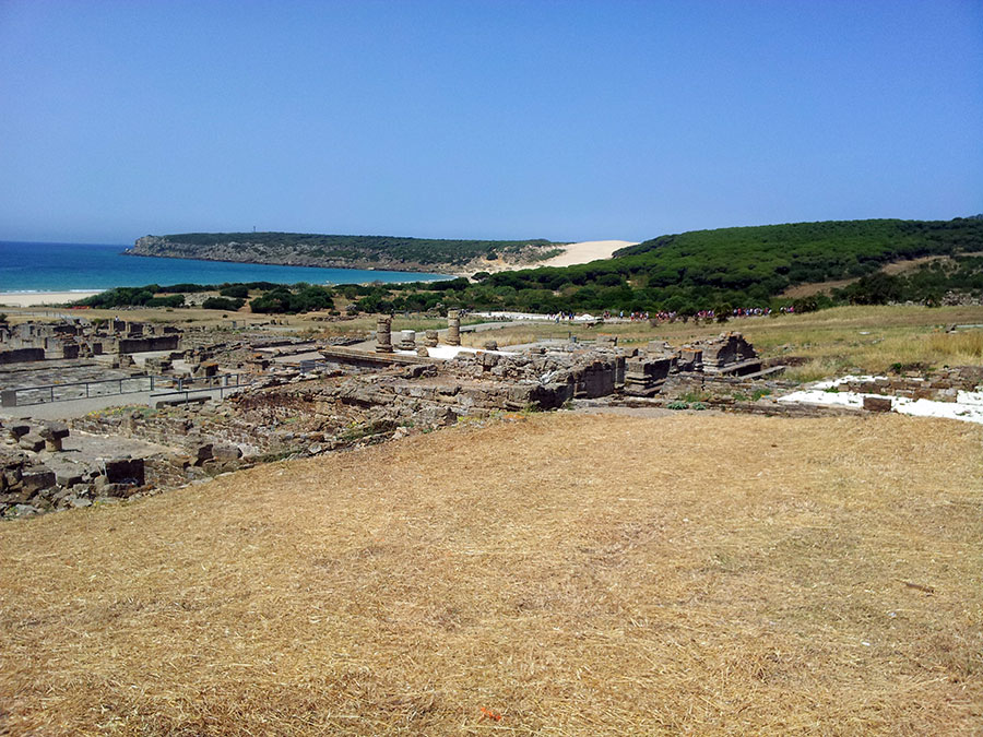 Baelo Claudia se localiza en una ensenada del litoral gaditano, en pleno estrecho de Gibraltar y delimita por los cabos de Paloma y Camarinal. Ésta pequeña bahía está rodeada por las elevaciones de la loma de San Bartolomé al este y las sierras de la Higuera y la Plata al oeste, que cierran el paso hacia el interior, al que sólo se accede por el denominado Puerto de Bolonia.