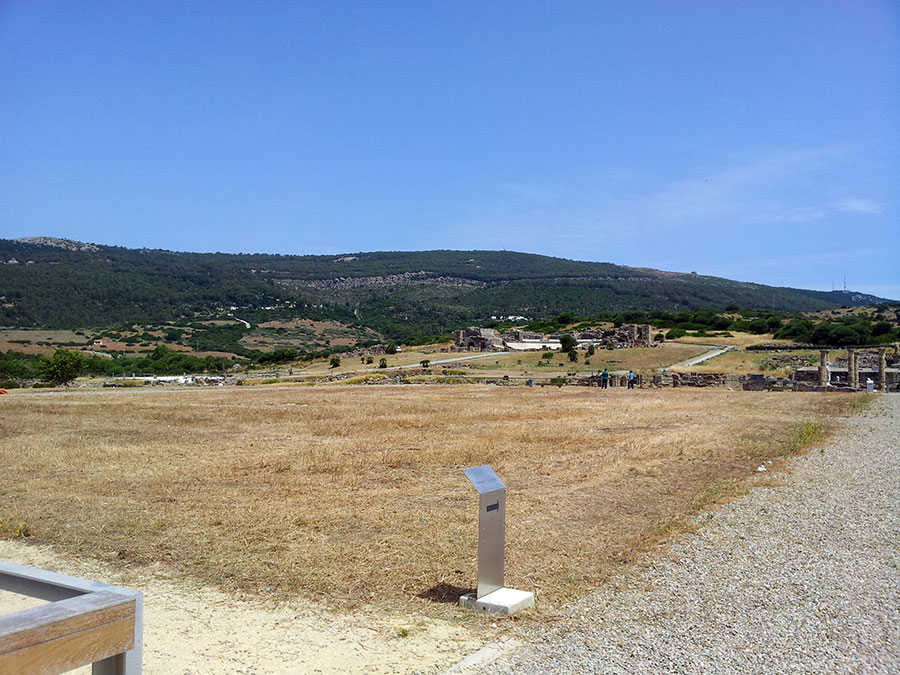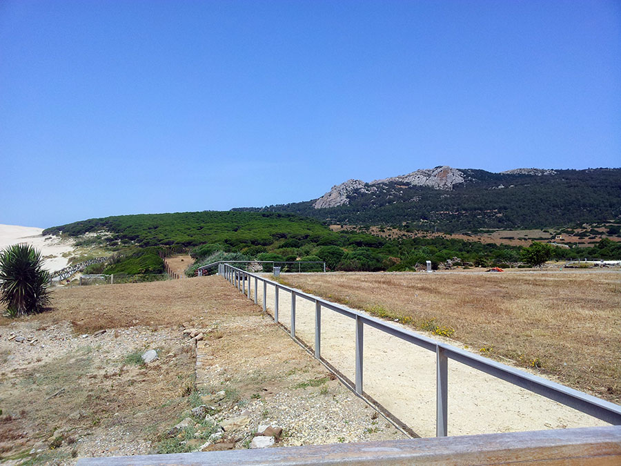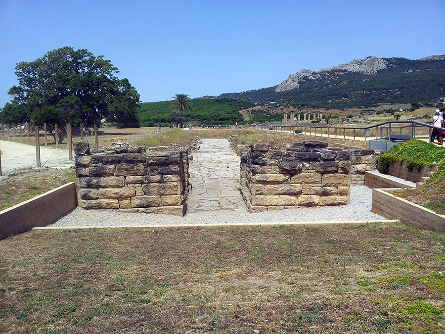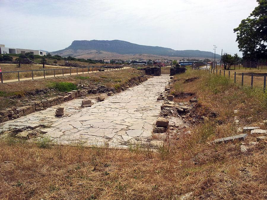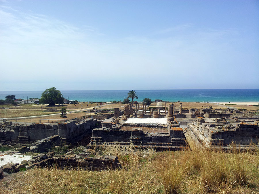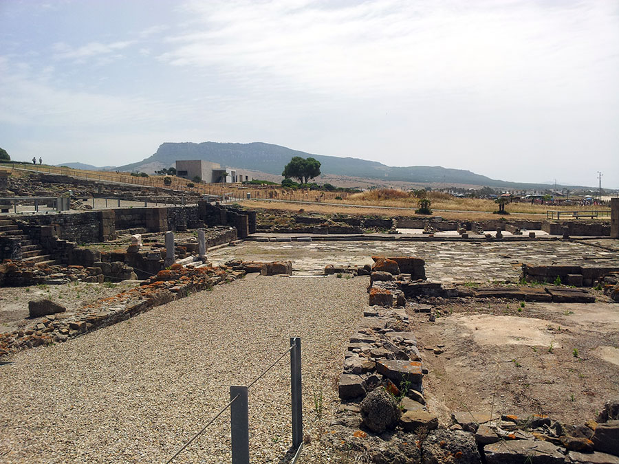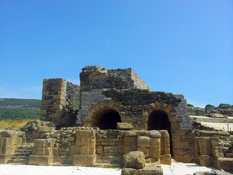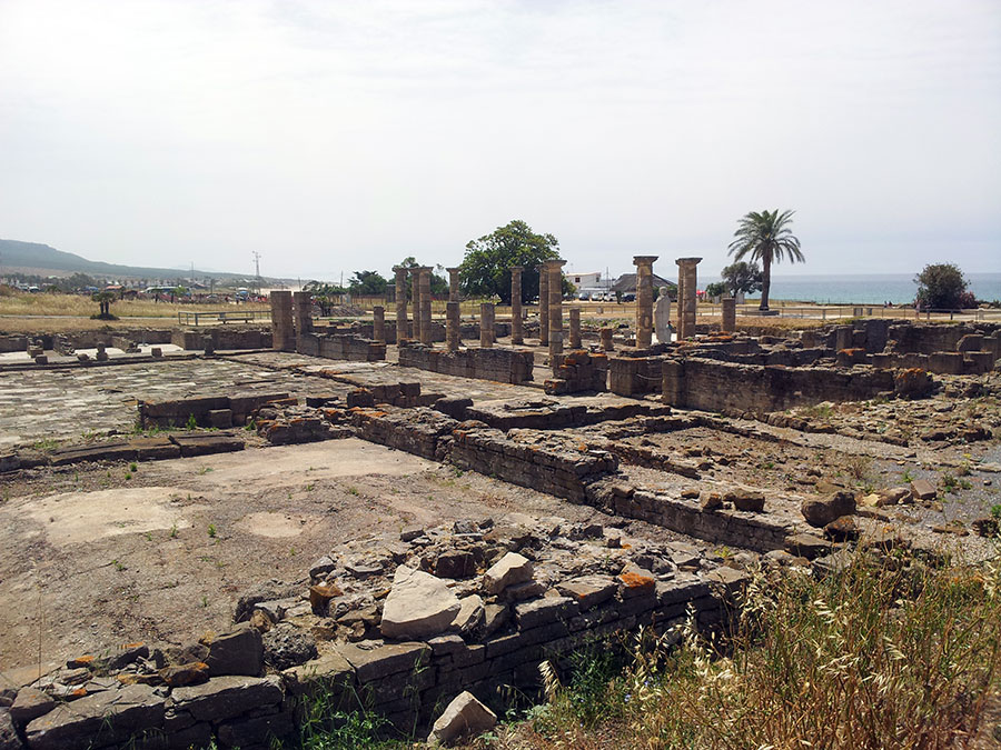 Baelo Claudia se localiza en una ensenada del litoral gaditano, en pleno estrecho de Gibraltar y delimita por los cabos de Paloma y Camarinal. Ésta pequeña bahía está rodeada por las elevaciones de la loma de San Bartolomé al este y las sierras de la Higuera y la Plata al oeste, que cierran el paso hacia el interior, al que sólo se accede por el denominado Puerto de Bolonia.