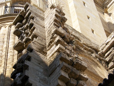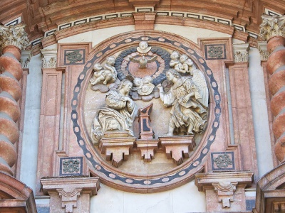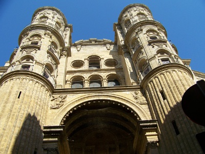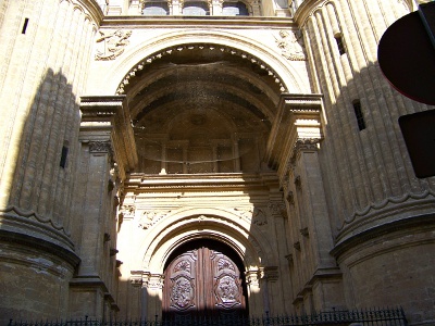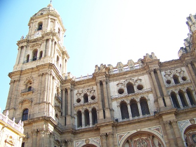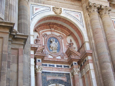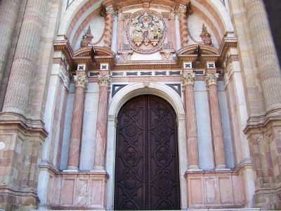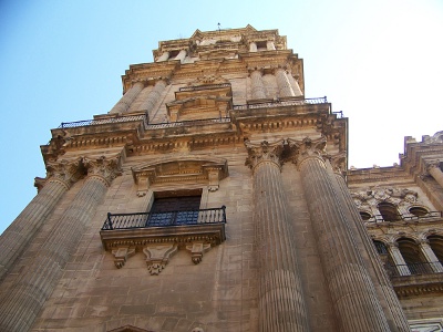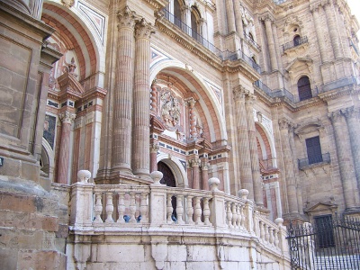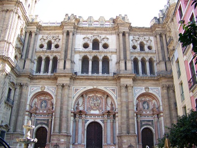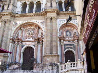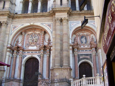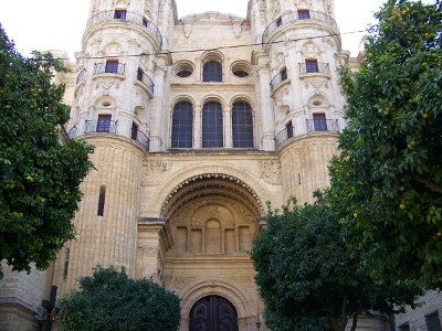 La tradición malagueña afirma que los dineros destinados a terminar esta torre fueron enviados a América para ayudar en la Guerra de Independencia. La otra torre se terminó en 1769 y tiene una placa en la que se lee: "Esta torre se acabó el dya tres de agosto del año mil setecientos sesenta y nueve, y tiene de alto desde la superficie de la calle hasta la extremedad del arpón ciento diez varas y media castellanas". En la Sala Capitular se pueden ver los planos de Bada. fechados en 1738. La verja se colocó en 1783 y es obra del maestro rejero Luis Gómez, que hizo igualmente las otras verjas. Los leones de mármol que rematan la balaustrada son obra de Agustín Valero, en 1772. La puerta principal es monumental, de estilo renacentista; junto a ella, dos puertas laterales en maderas nobles, con bellísimas tallas de Ortiz de Valdevieso representando la Anunciación y los lirios simbólicos. Sin embargo, el dibujo de la puerta principal se debe a Ventura Rodríguez, labrado por VilIanueva en 1764. Toda la fachada está revestida de ricos mármoles; sobre I a s puertas, tres grandes medio relieves; en su mitad, el medallón del arcángel Gabriel, en mármol blanco, anunciando el misterio de la Encarnación a María, que, según algunos, es obra de Villanueva. A los lados, encima de las dos puertas latera¡es, se encuentran medallones representando a los santos patrones de Málaga, Ciriaco y Paula, obra de Salazar. En el museo de la Catedral se ve un grabado que lleva 67 fecha de 1784 y fue hecho por el arquitecto Antonio Ramos; en él aparece la fachada completa, con las dos torres en el frontón, rematada por un templete y figuras alegóricas, las cuales nunca llegaron a construirse.