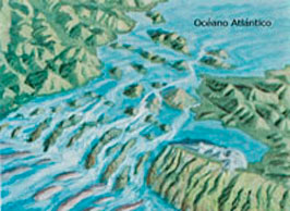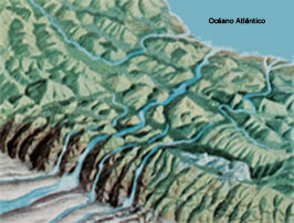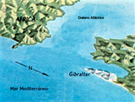 La Catarata Gigante del Estrecho Una catarata gigante de 14 kilómetros de ancho se hunde a cientos de metros de profundidad, cuyas aguas saladas procedentes del Océano Atlantico, darían lugar a lo que sería a continuación y repetidas veces el Mar Mediterráneo. El actual Peñón de Gibraltar, encabezaba a unos irregulares riscos en uno de sus extremos. Aquel sobrecogedor espectáculo ocurrió hace unos 5,5 millones de años apróximadamente. Mediante perforaciones en el fondo del Mar Mediterraneo se han encontrado acumulaciones de sal de 1.500 metros de espesor, que sólo podrían haberse formado en planicies expuestas a la marea y al calor alternativamente. Por lo que ésta lectura nos ofrece que el Mar Mediterraneo se secó y se llenó repetidas veces. Así en los últimos 5 millones de años las placas tectónicas áfricana y euroasiática han empujado un dique de plegamientos a modo de montañas en el Estrecho de Gibraltar. Así el mar se evaporaba, hasta que la "presa" cedía de nuevo, volviendo a inundarse el espacio mediterraneo con agua procedente del Atlántico. |