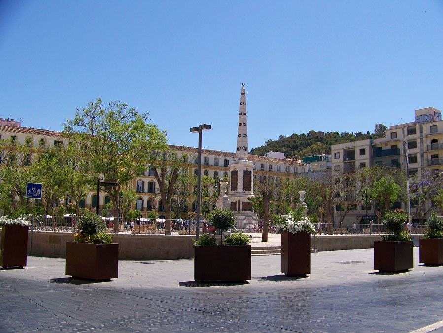 El autor de la obra fue el arquitecto municipal Rafael Mitjana, que realizó un primer anteproyecto que constaba de un zócalo de piedra rodeado de una balaustrada de hierro con farolas en las esquinas. Sobre el zócalo se proyecta un basamento con inscripciones en dos de sus frentes: “El pueblo de Málaga y su ilustre Ayuntamiento Constitucional, a la memoria de las 49 victimas sacrificadas el 11 de diciembre de 1831 por su amor a la libertad” y “a vista de éste ejemplo, ciudadanos, antes de morir que consentir tiranos”. Encima hay un tercer cuerpo con cuatro grandes relieves, en los que aparecen grabados los nombres de los patriotas muertos por la libertad. Sobre este pedestal se erige un obelisco coronado por una estatua de hierro colado, que representa a la Fama. Al final esta escultura no se llegó a realizar, sustituyéndose en sus funciones simbólicas por una corona de laurel. El domingo 11 de diciembre de 1842 se procedió al solemne traslado al monumento ya finalizado de los cuerpos de Torrijos y compañeros depositados hasta entonces en el cementerio de San Miguel. En su bóveda subterránea se introdujeron, tras los actos cívico-religiosos, cinco cajas, que contenían los restos de Torrijos, López Pinto, Flórez Calderón y las restantes victimas. Los edificios que rodeaban la plaza experimentan importantes cambios en esta centuria decimonónica. El convento de monjas de Santa María de la Paz, fundado en el año 1517 fue derribado y sobre su solar Antonio Campos construyó dos grandes edificaciones con cinco plantas y ático. El proyecto original fue realizado por el maestro de obras Rafael Moreno, aunque a partir del año 1870, se encargaría de la dirección de los trabajos el arquitecto Jerónimo Cuervo Gonzalez. El edificio es conocido tanto por el nombre del constructor como por el de uno de sus vecinos mas famosos, Pablo Ruiz Picasso, que habitó de niño una vivienda situada en la esquina occidental, donde se halla en la actualidad la fundación Picasso. El convento de la Merced, que ocupaba un inmenso solar en el costado occidental, fue desamortizado en el año 1836. La iglesia fue convertida en parroquia y el convento en cuartel, el cual fue derribado en el año 1889 y su extenso solar fue parcelado para viviendas. En uno de estos solares se erigiría el teatro Cervantes. La iglesia fue incendiada en el año 1931 y fue demolida tras la guerra civil. La ultima actuación sobre los edificios de la plaza se realizó sobre el hospital de Santa Ana, perteneciente al ayuntamiento. Derribado a comienzos del siglo XX, en su lugar el arquitecto malagueño Fernando guerrero Strachan proyecto en el año 1913 el cine Victoria Eugenia. |