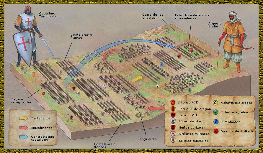 En 1195 las tropas castellanas de Alfonso VIII, sufrían una durísima derrota a manos Almohades, era en Alarcos, la ultima gran victoria musulmana en la península ibérica. Los almohades, mientras construian La Giralda y la Torre del Oro, acechaban los reinos cristianos y ambicionaban poseerlos. Preparaban una nueva invasión total de la peninsula Ibérica, en 1211, el Gran Califa almohade AL-Nasir, de 30 años, preparaba su gran ejército, cuya amenaza se cernía sobre los Reinos cristianos. En ese tiempo había 5 Reinos cristianos en Hispania, que se encontraban en luchas fraticidas por el control de tales Reinos; Pedro II, de la Corona de Aragón, Alfonso VIII de la Corona de Castilla, Sancho VII de Navarra, Alfonso IX de León y Reino de Portugal independizado desde el año 1143, con su Rey Alfonso I, reconocido por el Papa desde 1179. Era el momento para los 5 Reinos, o se unían o sucumbirian. Entre 1206 y 1212 los cristianos dieron los pasos necesarios para la Santa Cruzada. El Rey Alfonso VIII, convenció al Papa Inocencio para que declarase la Santa Cruzada contra los almohades. Los pulpitos eclesiales de toda Europa animaban a alistarse en esa Cruzada. Miles de caballeros desde Alemania, desde Italia y desde Francia. A su frente el Arzobispo de Narbon. Mayo de 1212 en Toledo, capital visigoda, donde vivían en perfecta armonía; los mudejares, los hebreos y los cristianos. Aqui fue el punto central donde se aglutinaron la tropas. A los Cruzados europeos les extrañó ésta situación de perfecta armonía y convivencia entre las tres culturas. Éstos Cruzados, asaltaron la judería y produjeron rapiñas en los barrios, muy a pesar del Rey Alfonso VIII, que hizo la vista gorda, pese a la masacre. 20 de Junio de 1212; parten 100.000 hombres con el vizcaíno Don Diego Lope de Haro en vanguardia. Aquel ejército llegaba a La Mancha, donde se encontraba la fortaleza de Malagón, cuyos frailes pobladores negociaron su rendición, siendo pasados a cuchillo a los defensores de la fortaleza. El Rey Alfonso VIII vió la escena horrorizado, había que negociar, el veía las cosas de otra manera. Los cristianos extranjeros disentian en la manera en que los cristianos peninsulares querian llevar las cosas. Se generaba malestar entre ambas partes. Dias más tarde llegaron estas huestes extranjeras a la fortaleza de Calatrava. Alfonso VIII, sí llegó en ésta ocasión a tiempo para negociar y a cambio de no combatir les permitió salir con vida. Esto encrespó las iras de los cruzados extranjeros que tambien por el hambre, decidieron abandonar la marcha. Los hispanos se quedaban solos, los cruzados extranjeros suponian 1/3 del total. Por tanto el ejército de Alfonso VIII no superaba los 80.000 efectivos. |